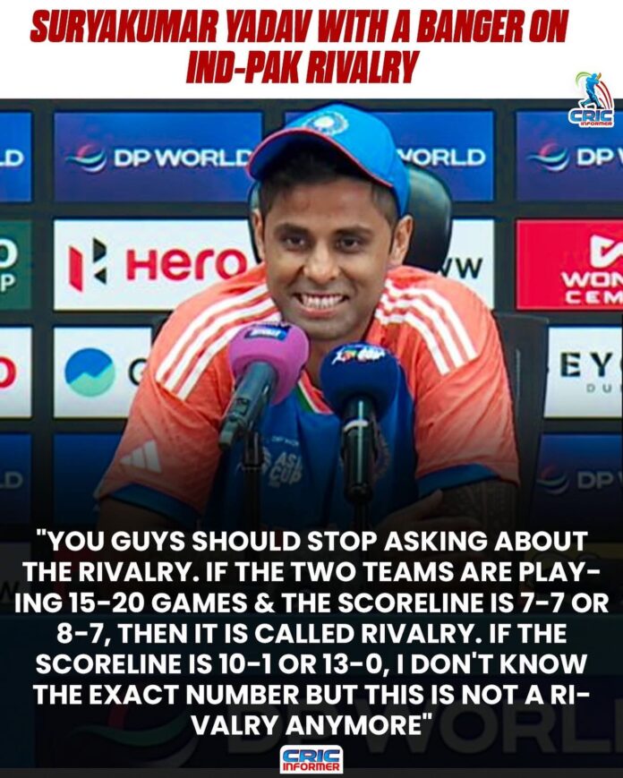 ஆனால் 13-0, 10-1 (கணக்கு சரியாக தெரியவில்லை) என்று இருந்தால் அது ஒரு போட்டியே (Rivalry) கிடையாது என போட்டி முடிந்த பிறகு இந்திய அணி கேப்டன் சூர்யகுமார் யாதவ் நிருபர்கள் சந்திப்பில் கூறியுள்ளார்.