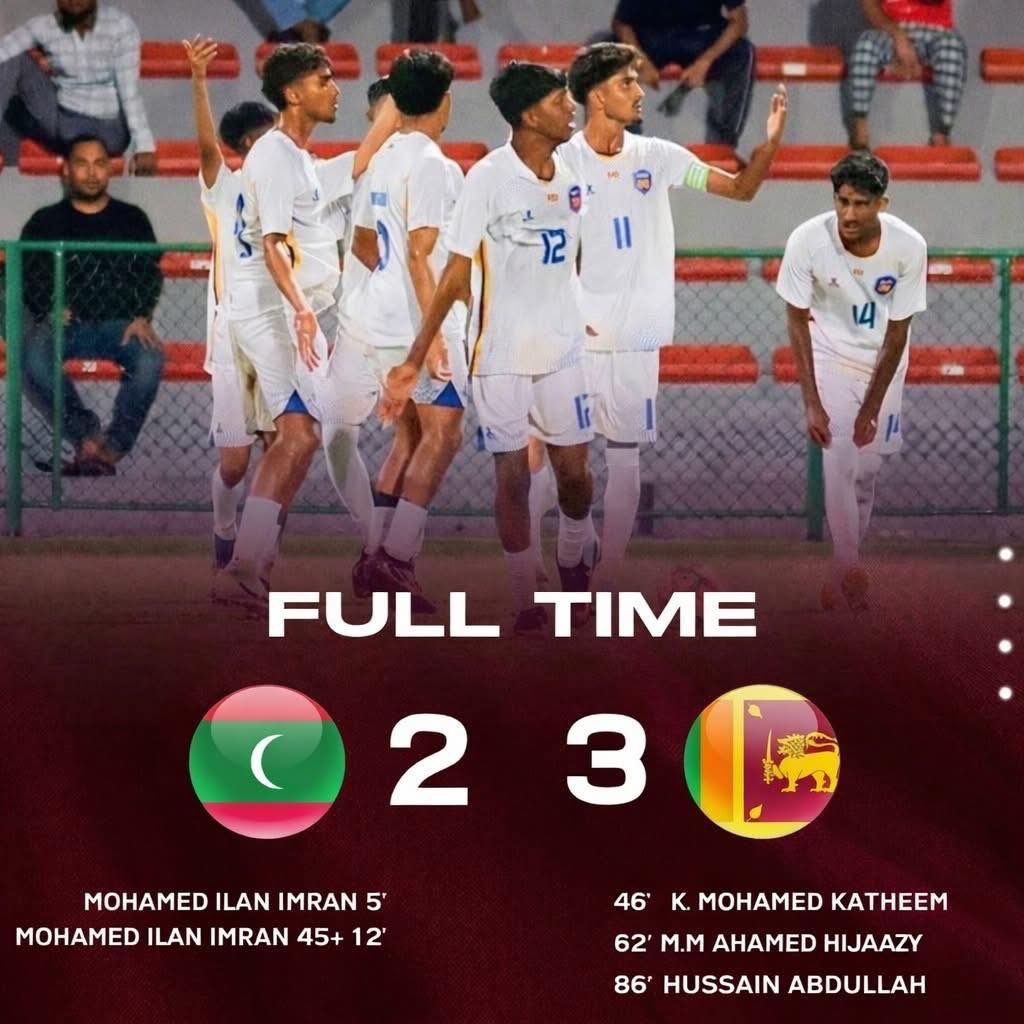 SAFF U20 சாம்பியன்ஷிப் போட்டியில், இடைவேளையின்போது 2-0 என்ற கோல் கணக்கில் பின்தங்கியிருந்த இலங்கை, இரண்டாம் பாதியில் 3 கோல்களை அடித்து 86-வது நிமிடத்தில் வெற்றியை உறுதிசெய்து, 3-2 என வெற்றியைப் பதிவு செய்தது.