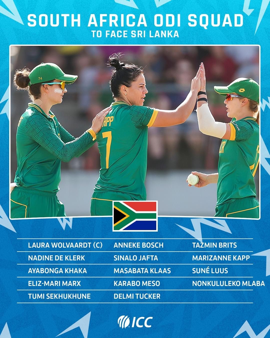 இலங்கை மகளிர் அணியுடன் நடைபெறவுள்ள 3 போட்டிகள் கொண்ட ஒரு நாள் கிரிக்கெட் போட்டிக்கான தென்னாபிரிக்க மகளிர் குழாம் பெயரிடப்பட்டுள்ளது.