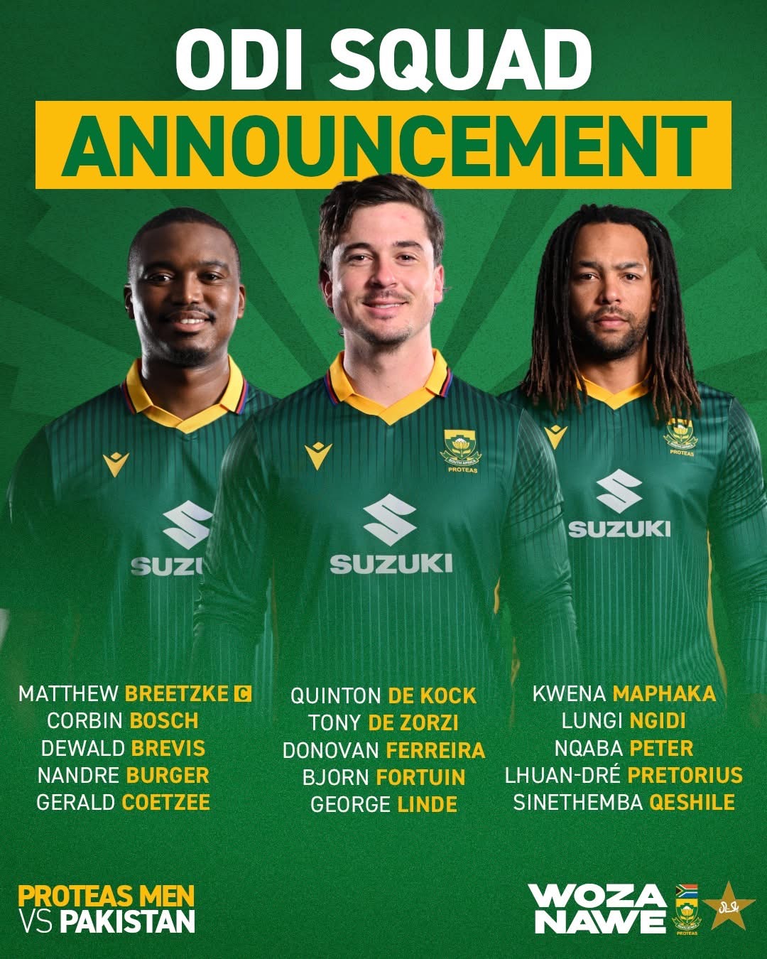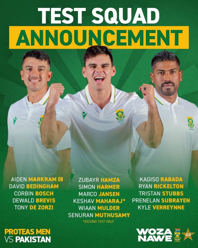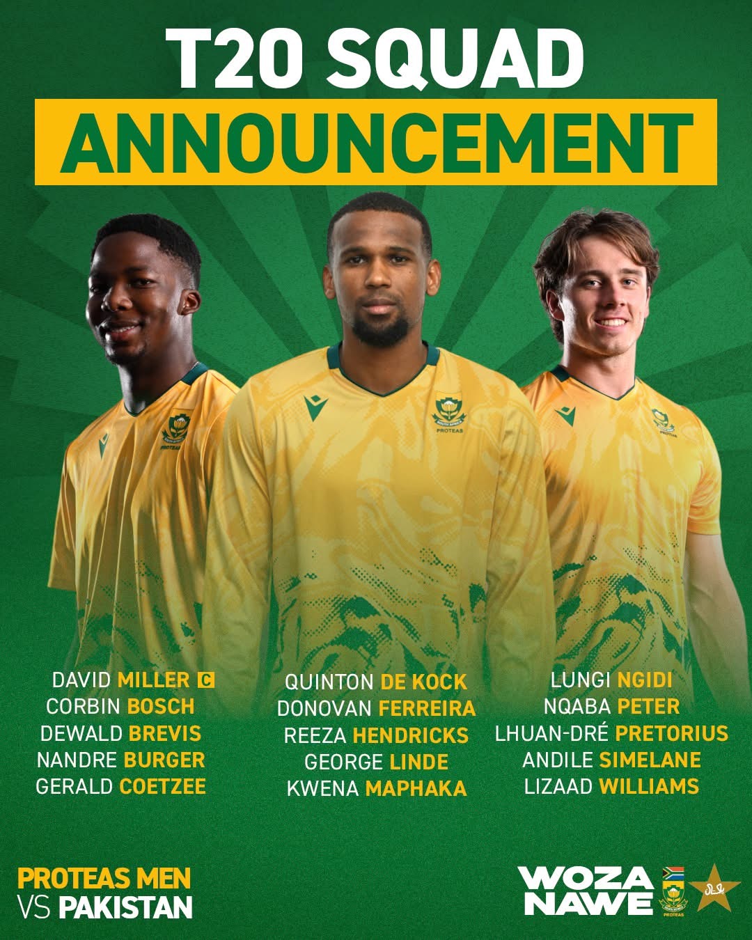 தென்னாப்பிரிக்க ஆண்கள் தேர்வுக் குழு, பாகிஸ்தானக்கு எதிராக அடுத்து வரவிருக்கும் அனைத்து வடிவ சுற்றுப்பயணத்திற்கும், நமீபியாவுக்கு எதிரான ஒரே ஒரு டி20 சர்வதேச போட்டிக்கும் அணிகளை அறிவித்துள்ளது.
