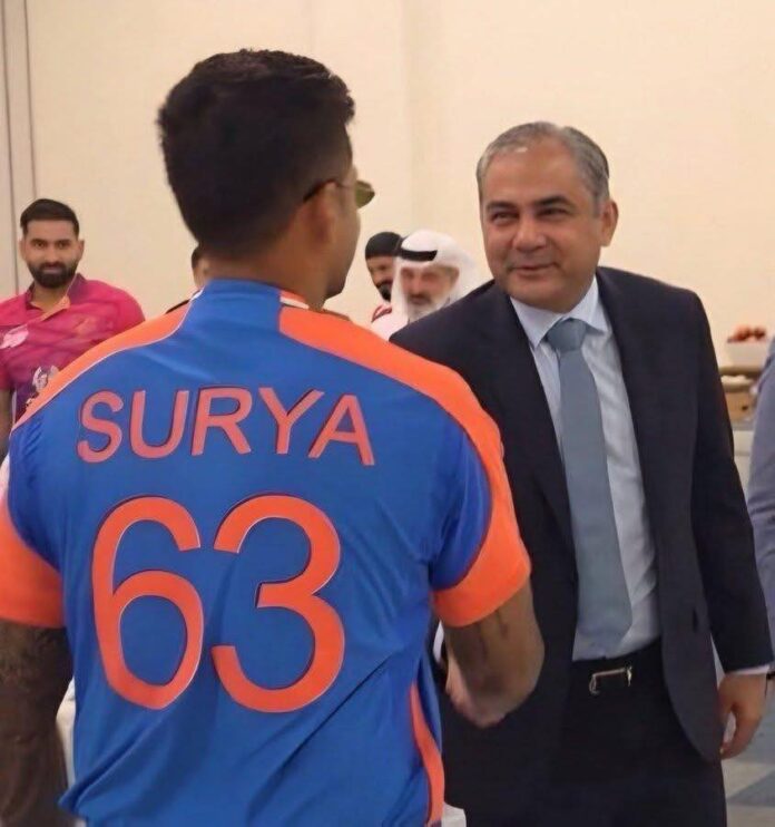 ஆசிய கோப்பை தொடங்குவதற்கு முன்பு, டி20 கேப்டன் சூர்யகுமார் யாதவ், ஆசிய கிரிக்கெட் கவுன்சில் தலைவர், பிசிபி தலைவர் மற்றும் பாகிஸ்தான் உள்துறை அமைச்சர் மொஹ்சின் நக்வியுடன் கைகுலுக்கினார்.
